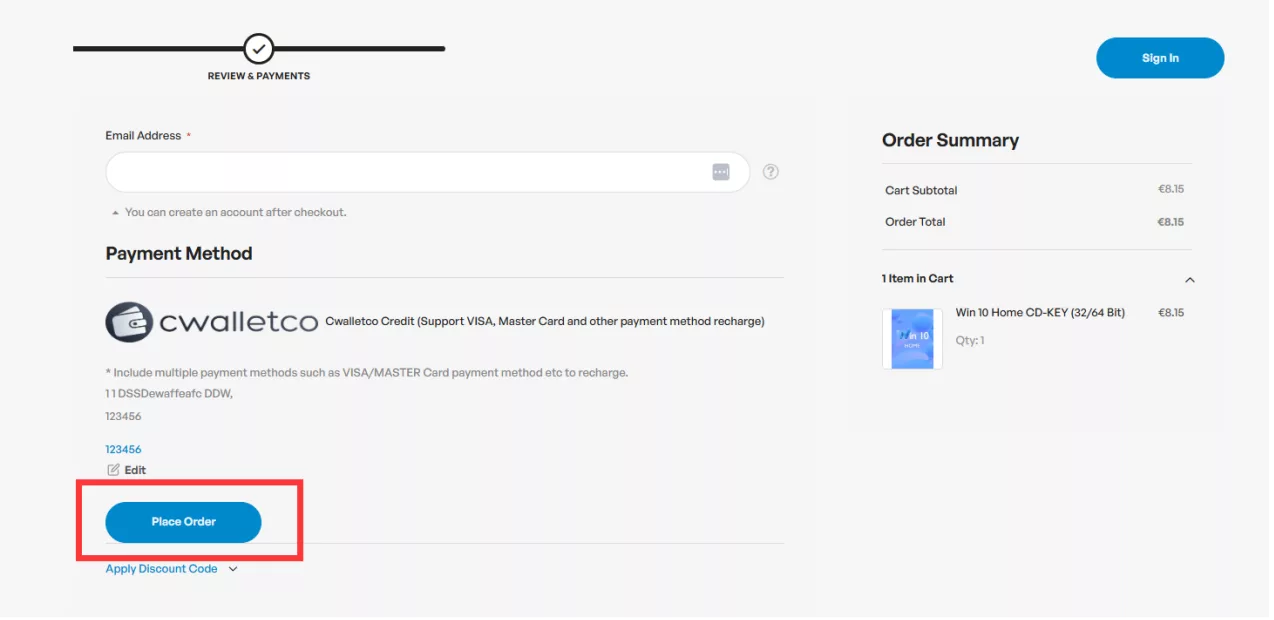 Selectează CWALLETCO la pasul următor și click Place Order.