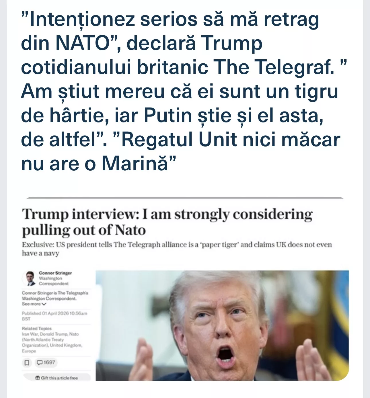 Trump, conform art.13 trebuie sa bage preavizu’ cu 1 an inainte de iesirea din NATO. Plus, are nevoie de aprobarea congresului, s-ar declansa o lupta pe constitutie cu privire la retragarea din aliante (presedinte versus congres) cu implicarea directa a curtii supreme. Eu nu mi-as face griji prea mari, dilaul e pe duca, mai trebuie putin periat pana la toamna cand SPER sa piarda mid-terms.