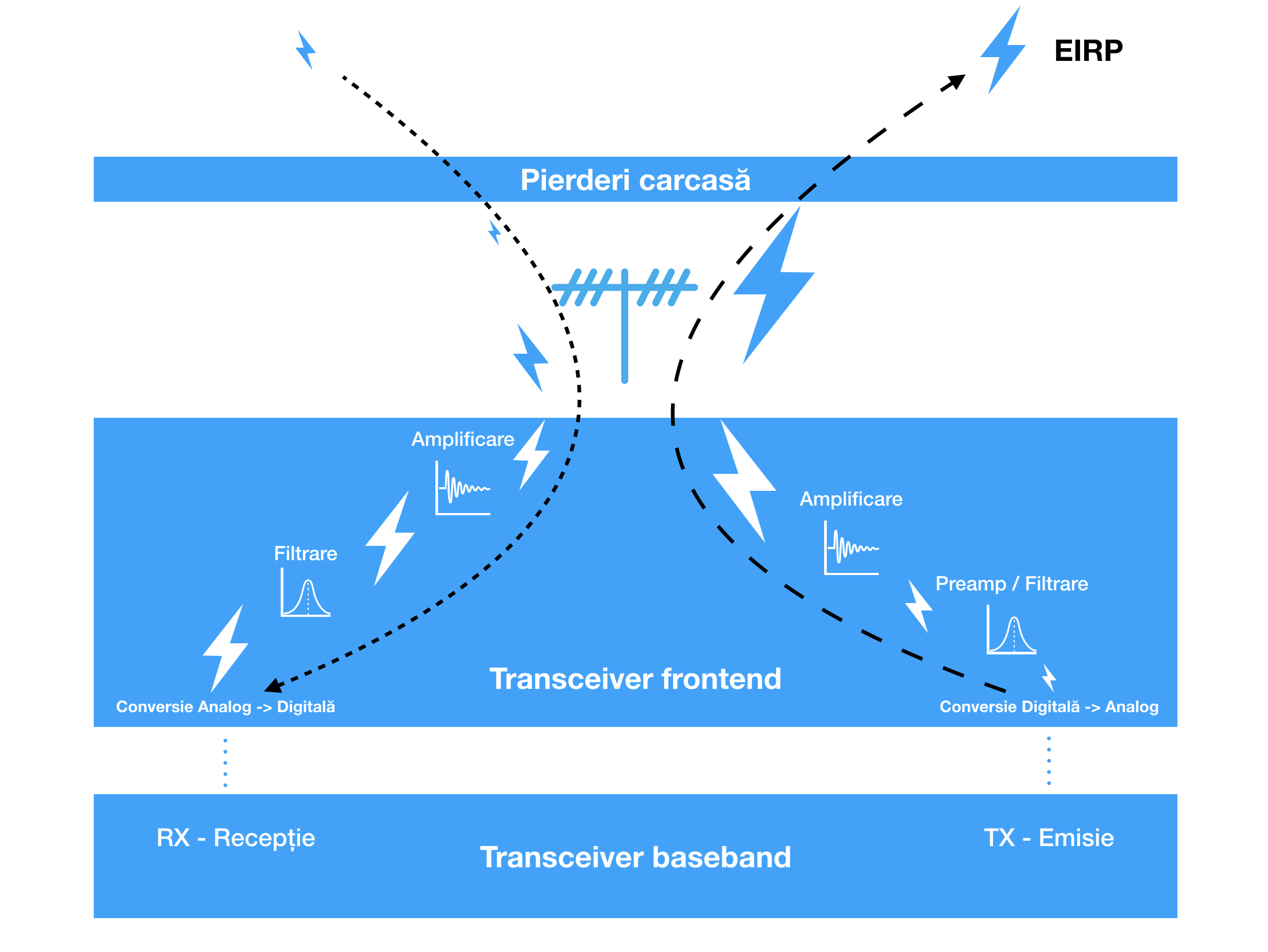 Mai exact, puterea efectivă de emisie într-o singură direcție este calculată ca fiind suma dintre amplificarea produsă de antene și puterea totală a amplificatoarelor de emisie, minus pierderile generate de carcasă. Uite o schemă vizuală care probabil ajută. Se poate observa și puterea de emisie sau recepție în fiecare stadiu.
