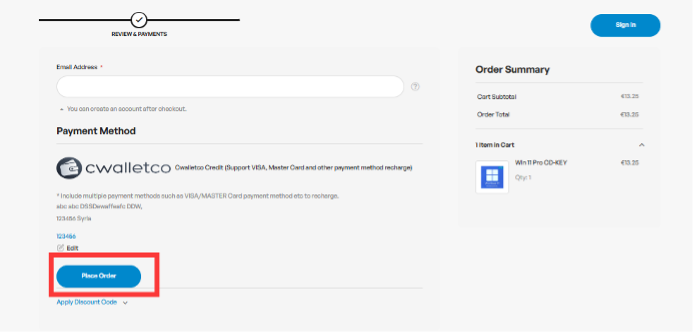 Selectează CWALLETCO la pasul următor și click Place Order.