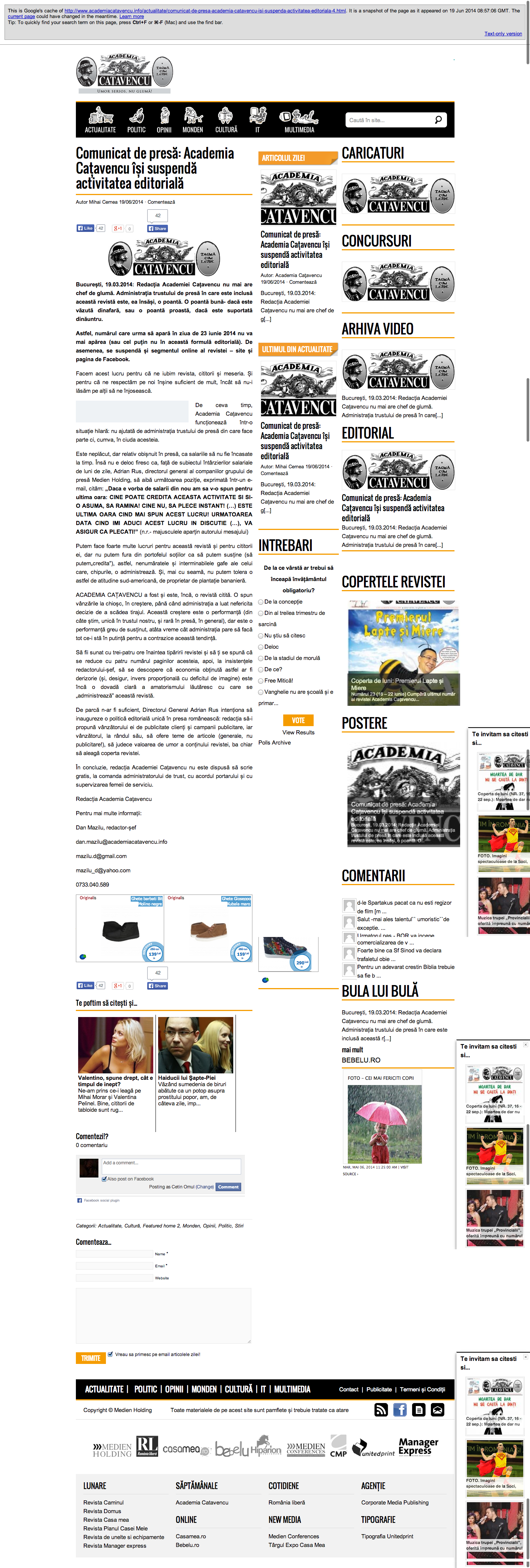 București, 19.03.2014(banuiesc ca e un typo): Redacția Academiei Cațavencu nu mai are chef de glumă. Administrația trustului de presă în care este inclusă această revistă este, ea însăși, o poantă. O poantă bună- dacă este văzută dinafară, sau o poantă proastă, dacă este suportată dinăuntru.Astfel, numărul care urma să apară în ziua de 23 iunie 2014 nu va mai apărea (sau cel puțin nu în această formulă editorială). De asemenea, se suspendă și segmentul online al revistei – site și pagina de Facebook.
