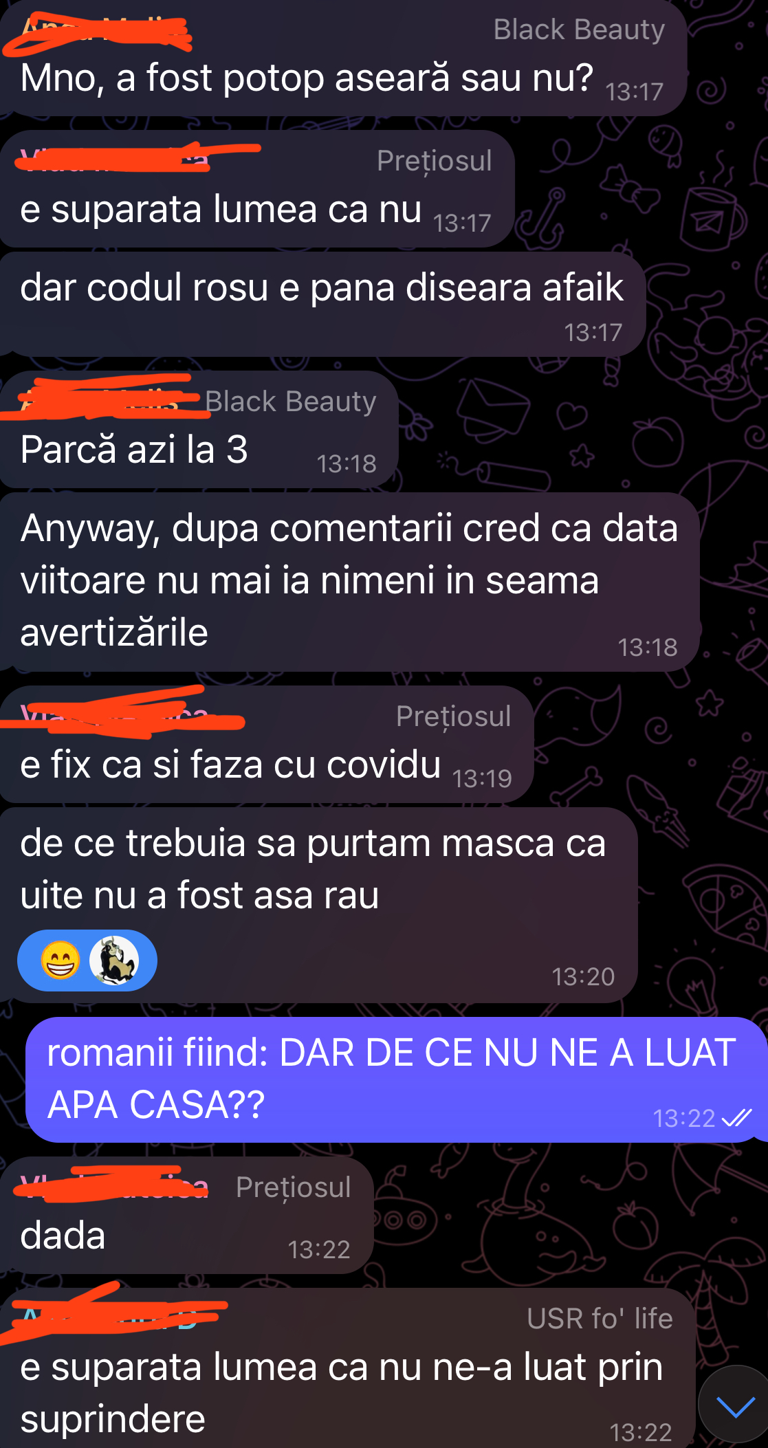 Vă jur, nu ai cum asa ceva. Oamenii sunt suparati, pe net, ca nu a plouat mai tare. Ce kkt fel de cod rosu e asta, de abia s-a umezit putin pe jos, va bateti joc de noi?