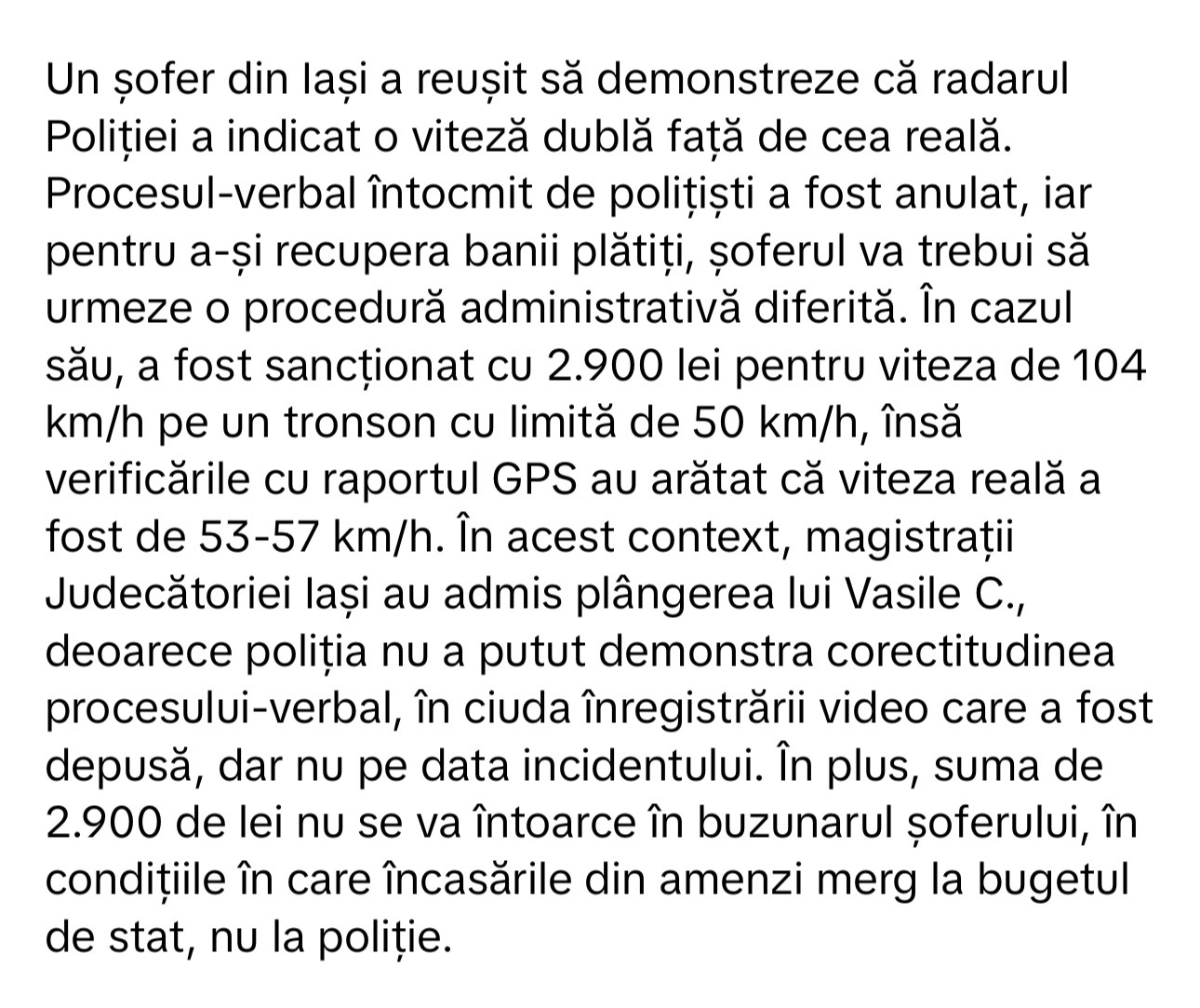 Ah stai, acum mi-a picat fisa. Polițiștii au completata PV-ul cu data greșită domn’ Vasile a văzut asta si a tăcut știind ca o sa câștige in instanță. Omul a facut contestație, cum e normal, iar instanța a cerut MAI-ului proba, adică înregistrarea video. Doar ca înregistrarea avea o data diferită față de ce era pe procesul verbal. Adica era domn’ Vasile la volan, surprins cu viteza de 104 km/h, in localitate, pe limită de 50.