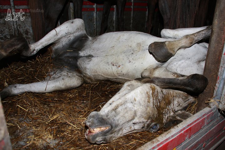 chiar dacă sunt de acord cu sacrificarea animalelor pentru carne, în același timp cred că suntem datori să nu le chinuim și să le micșorăm cât se poate de mult suferința. din păcate acest lucru nu prea se face – și nu doar în România – de la puii KFC cu ciocul tăiat, crescuți cu miile pe suprafețe mici, până la caii bolnavi de la Letea, „tranportați„ ca în imaginile de mai sus…