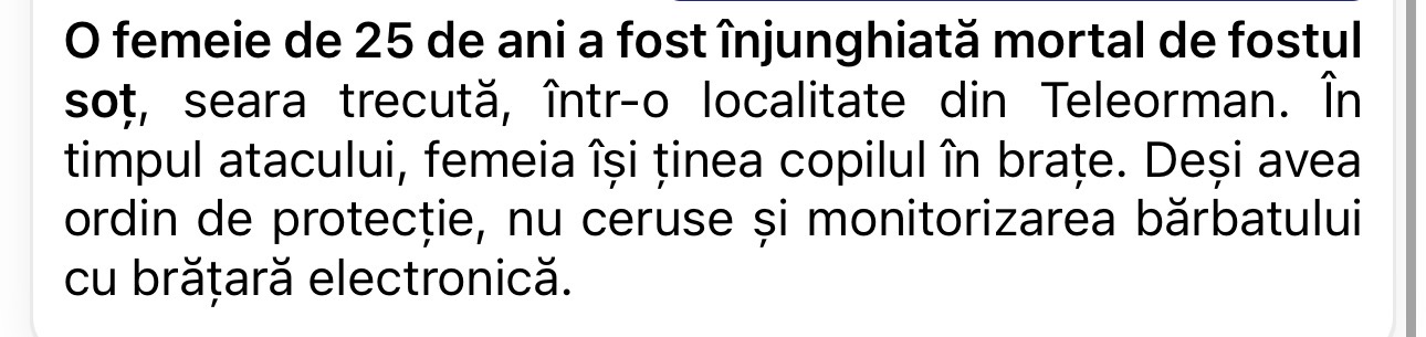 Totodată, la data de 26 septembrie, polițiștii au fost sesizați de femeia de 25 de ani despre faptul că soțul ei ar fi încălcat ordinul de protecție, prin aceea că ar fi luat-o cu forța dintr-un parc, din municipiul Turnu Măgurele, ar fi băgat-o în autoturismul său, ar fi mers în extravilanul municipiului, unde ar fi blocat ușile autovehiculului și ar fi întreținut cu aceasta relații sexuale împotriva voinței sale’, precizează IPJ Teleorman.