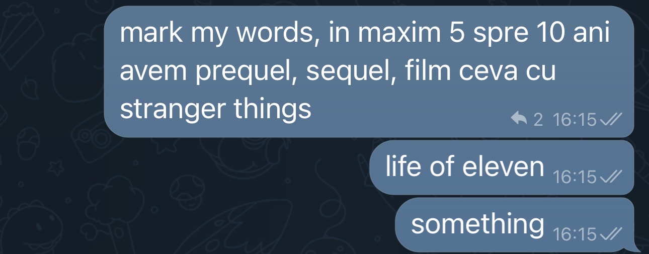 In rest? Mna, sunt nostalgic ca s-a terminat, usor enervat ca l-au terminat prea tarziu ca Millie Bobby Brown sa mai arate macar a femeie, cu curul ala imens si fața incremenita in botox. E evident ca a fost o serie gândită doar pentru un sezon, restul a fost doar cashgrab de la Duffel Brothers, care abia astept sa devina Duffel sisters. Pacat ca a ajuns in oala Lost, Prison Break si alte seriale gandite pentru un sezon, dar distruse de lacomia producatorilor.