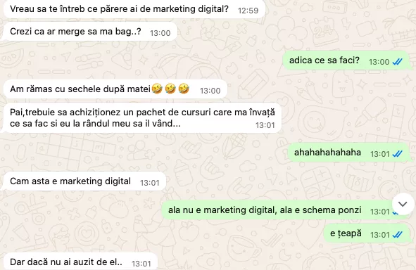 În ultimele 2 luni se propagă cu viteză o nouă țeapă în online, țeapa cu marketingul digital. O schemă ponzi cu cursuri, cam cum sunt alea cu coach, coach de coach, super coach și coach digital, doar că mai pentru proști.