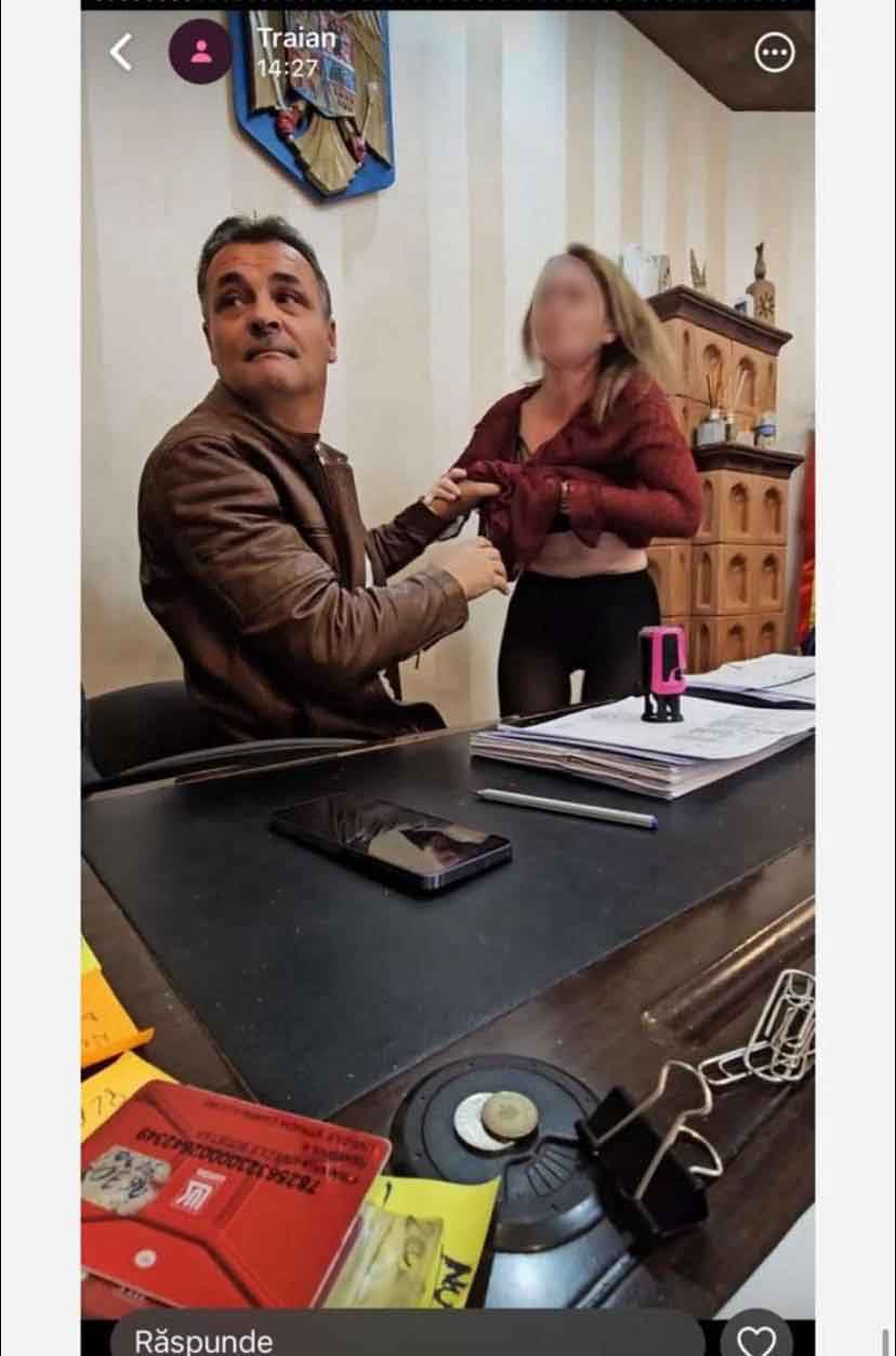 Femeia este secretara primariei si are numele afisat pe site-ul primariei. Poti sa-i blurezi fata daca vrem s-o ardem deontologic, dar deja raul a fost facut.