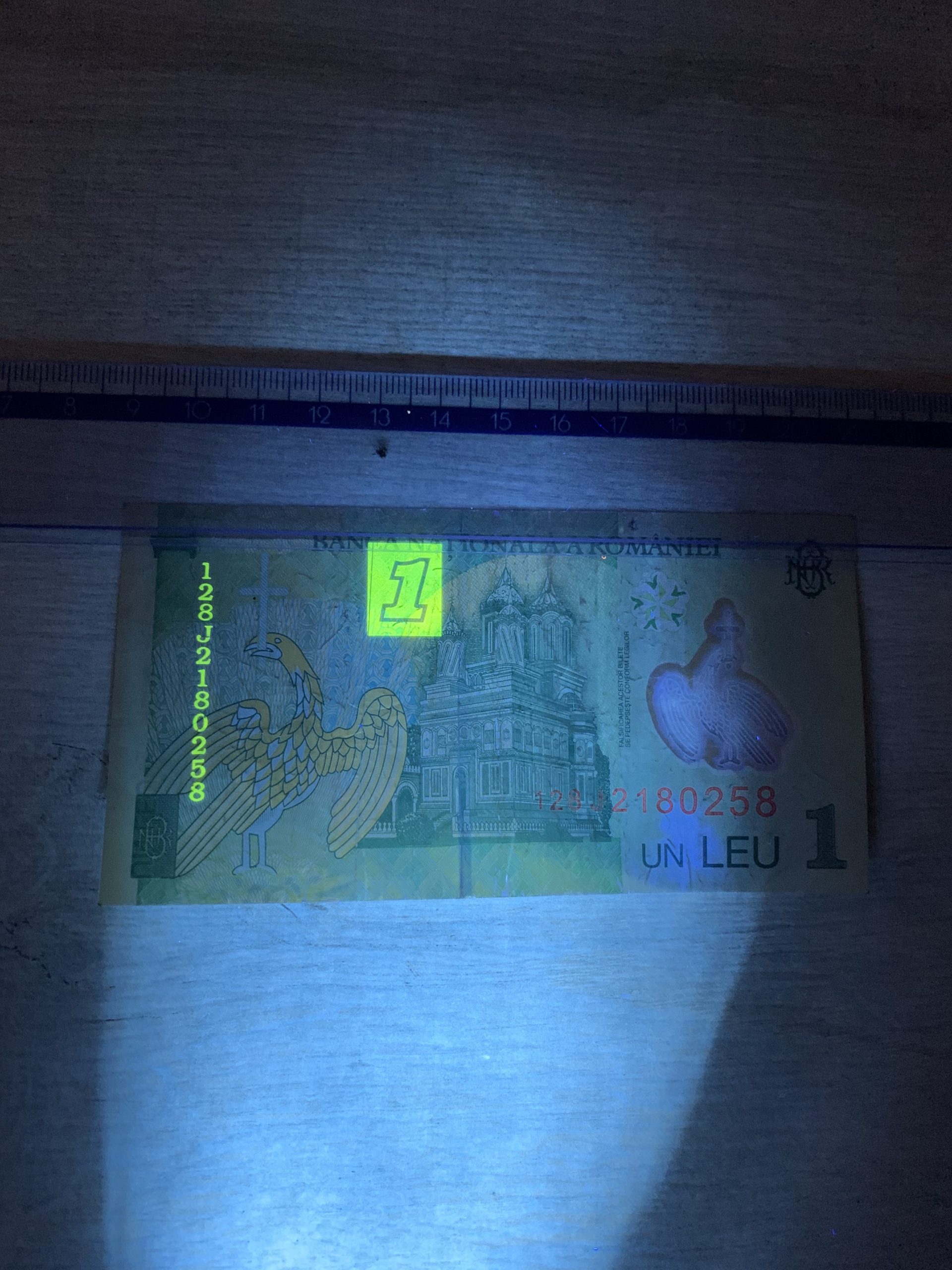 Bancnota e un test ok cu mențiunea că există bancnote uzate sau spălate des care pierd cerneala UV. Faptul e des întâlnit în banci care procesează numerar cu mașini de numărat care certifică pattern IR și UV pe lângă thickness, opacitate și magnetic. 1 RON și 5 sunt cele mai afectate apoi valutele pe hârtie.