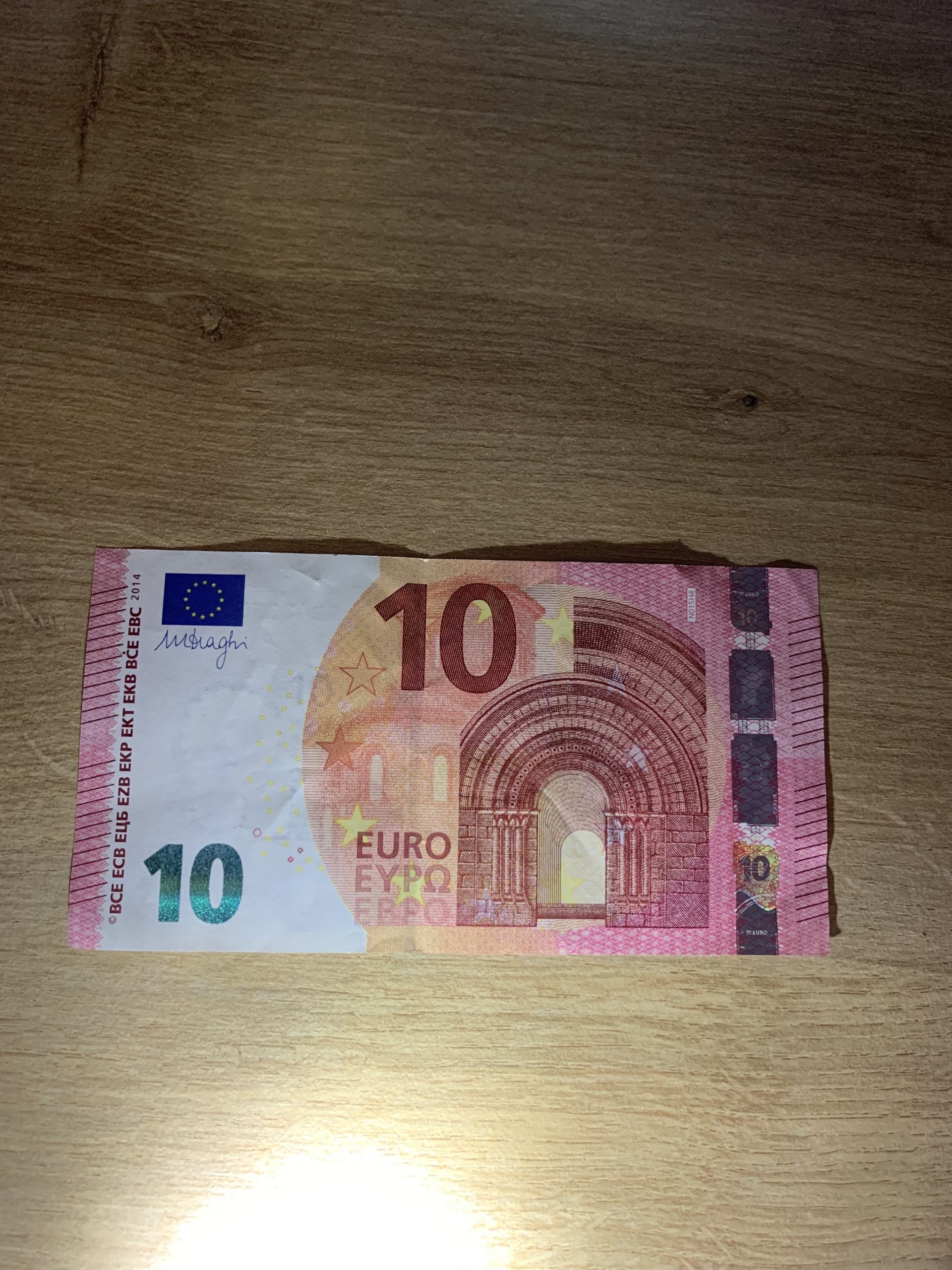 Uite cum se vede la mine bancnota de 10 eur, sub lumină albă și sub lumina neagra UV-A.