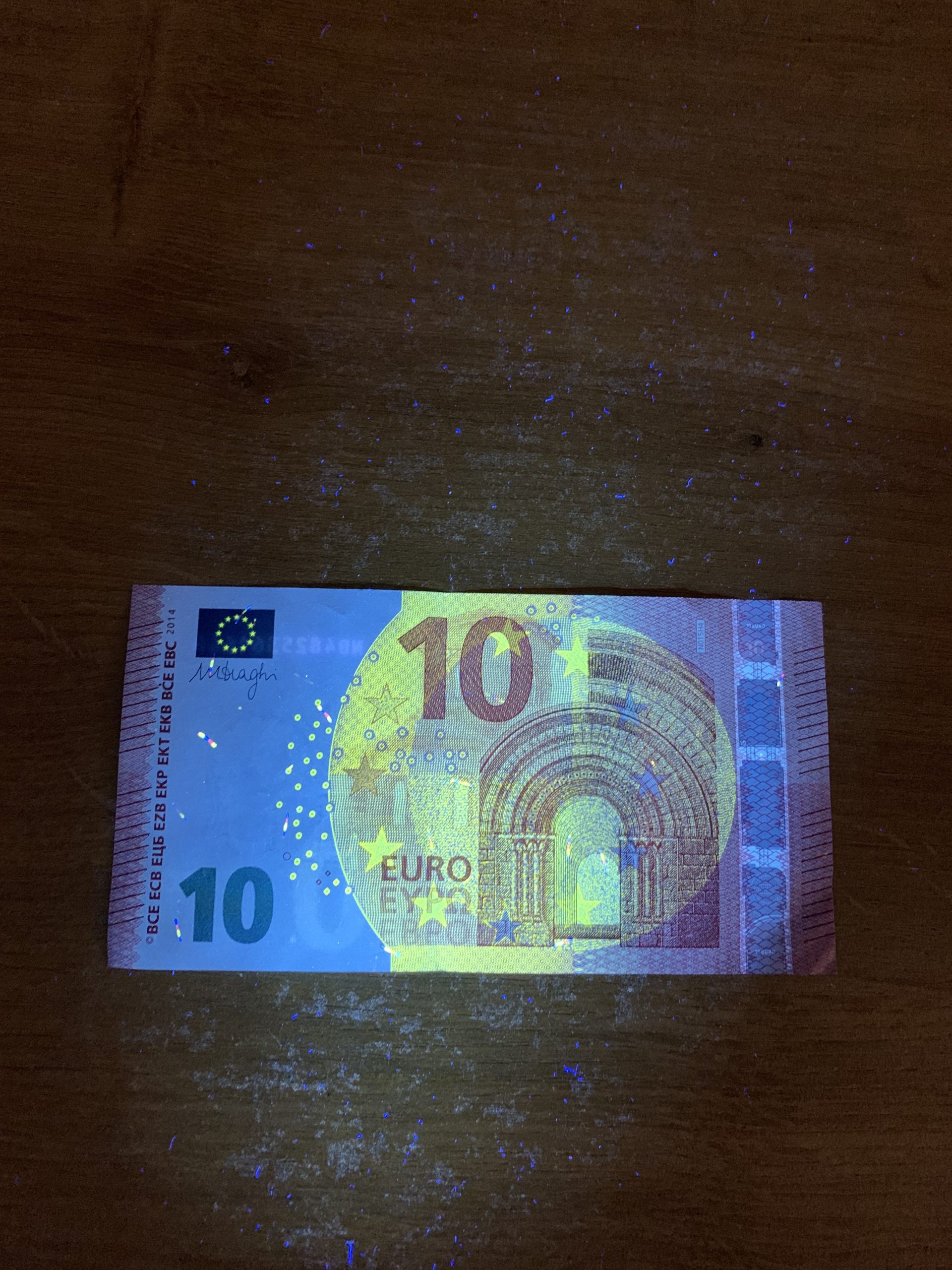 Bancnota de 10 euro (de fapt, toate bancnotele europene, dar pe asta o am eu acasă) are elemente de siguranță care se văd diferit sub lumina UV-C (culoarea e roșie). Pozele sunt ciordite de aici. Dacă vedeți ca în poza a doua, felicitări! Aveți lumină UV-C. Dacă nu….