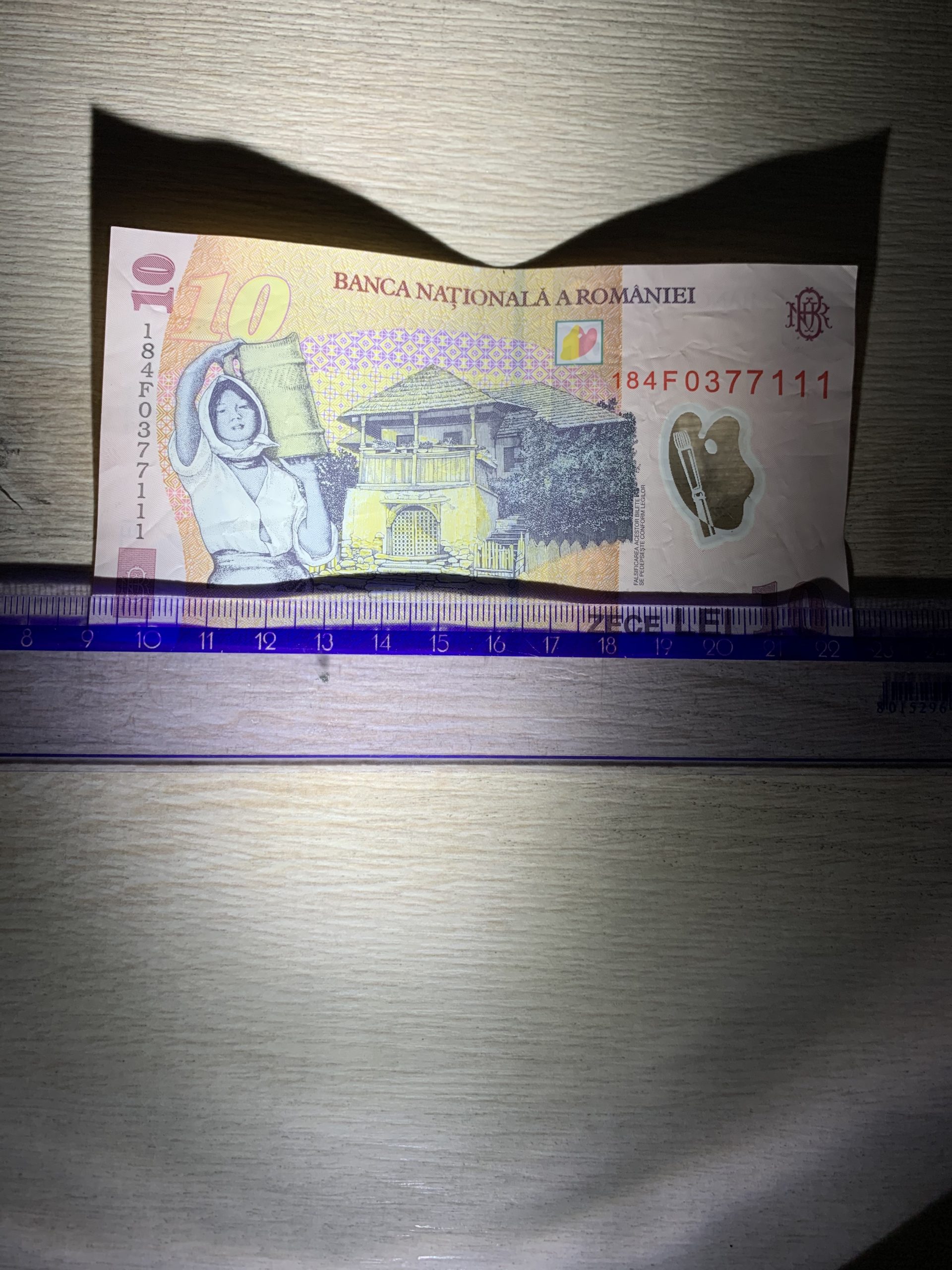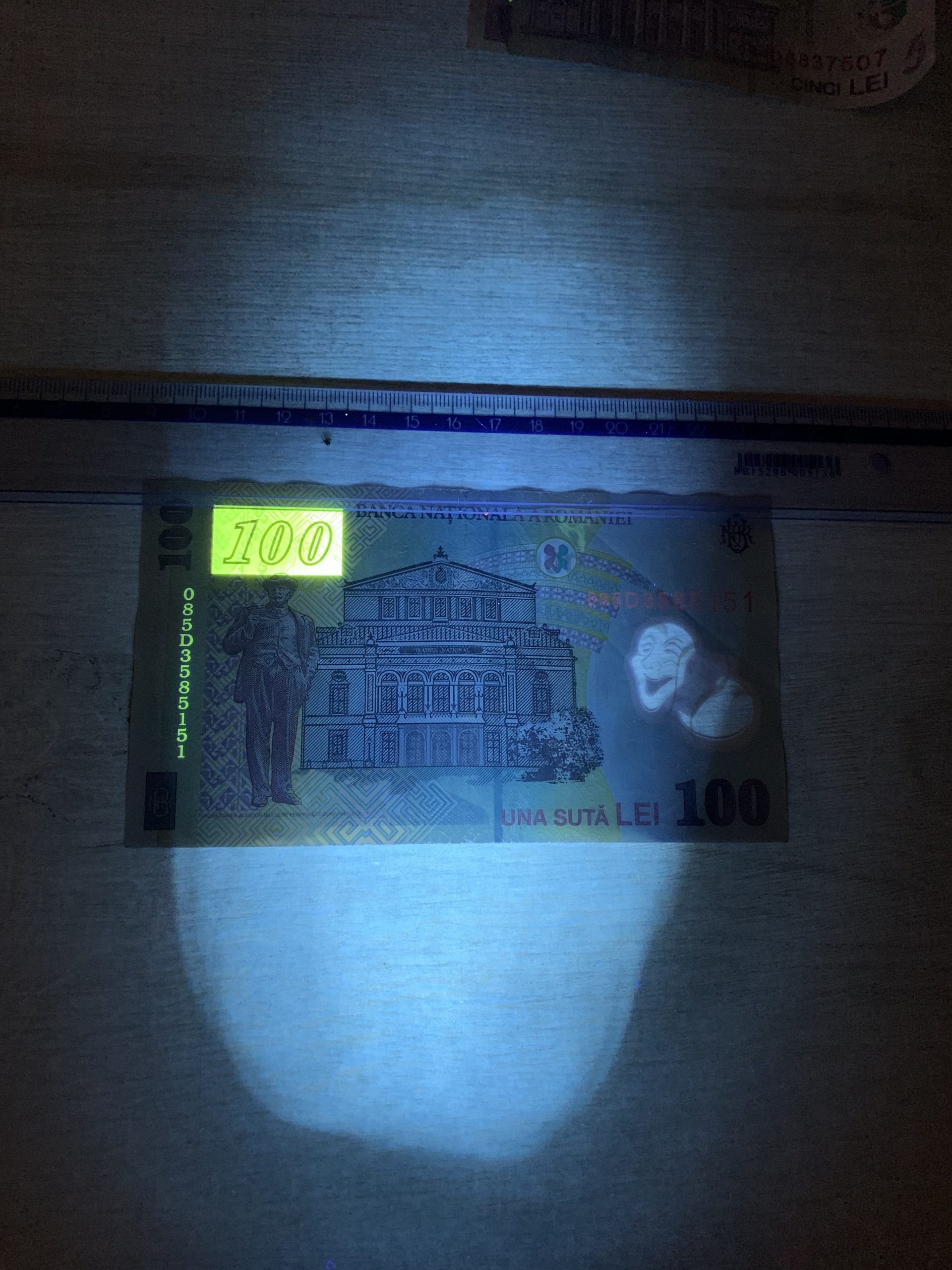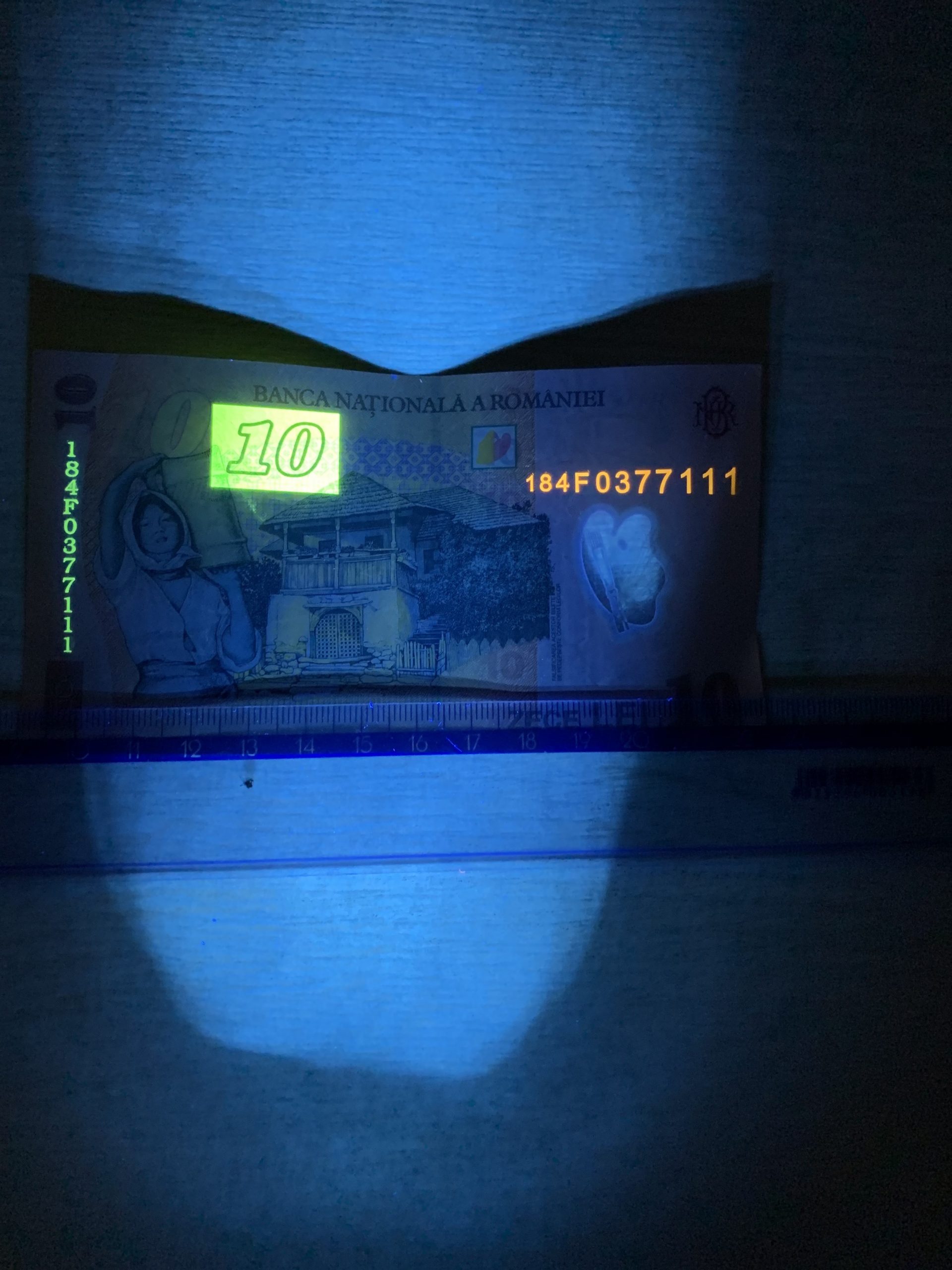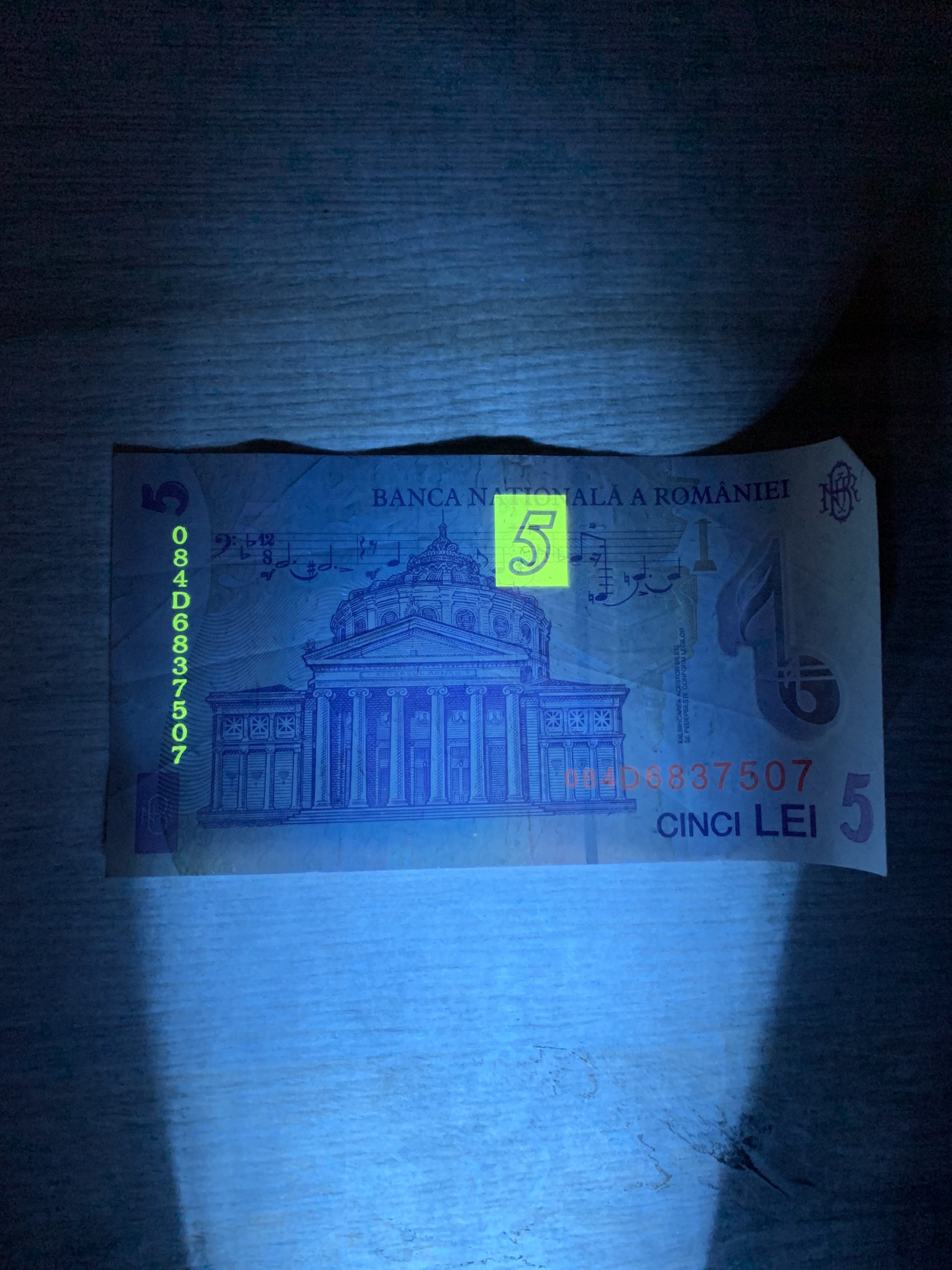 Uite niște exemple, la bancnotele românești, sub lumină albă (stânga) și UV-A, în spectrul 365-370nm (eu doar din asta am în laborator, deci tăceți și placă-vă). Sub lumină UV-C, e posibil să se vadă altfel, dar tot se discern elementele de siguranță. Sub lumină albă sau colorată….vedeți poza din stânga.